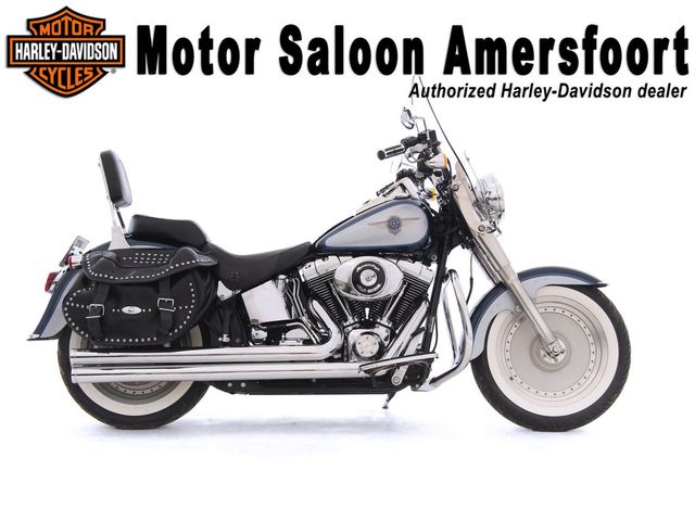 Gave Harley-Davidson FLSTF Softail Fat Boy. Geleverd in de originele two-tone kleurstelling Luxury Blue Ice. De Vance & Hines long shots zorgen voor het kenmerkende Harley-Davidson geluid. Het afneembare windscherm kan extra comfort leveren maar is zonder gereedschap er ook snel vanaf te halen als dat wenselijk is.